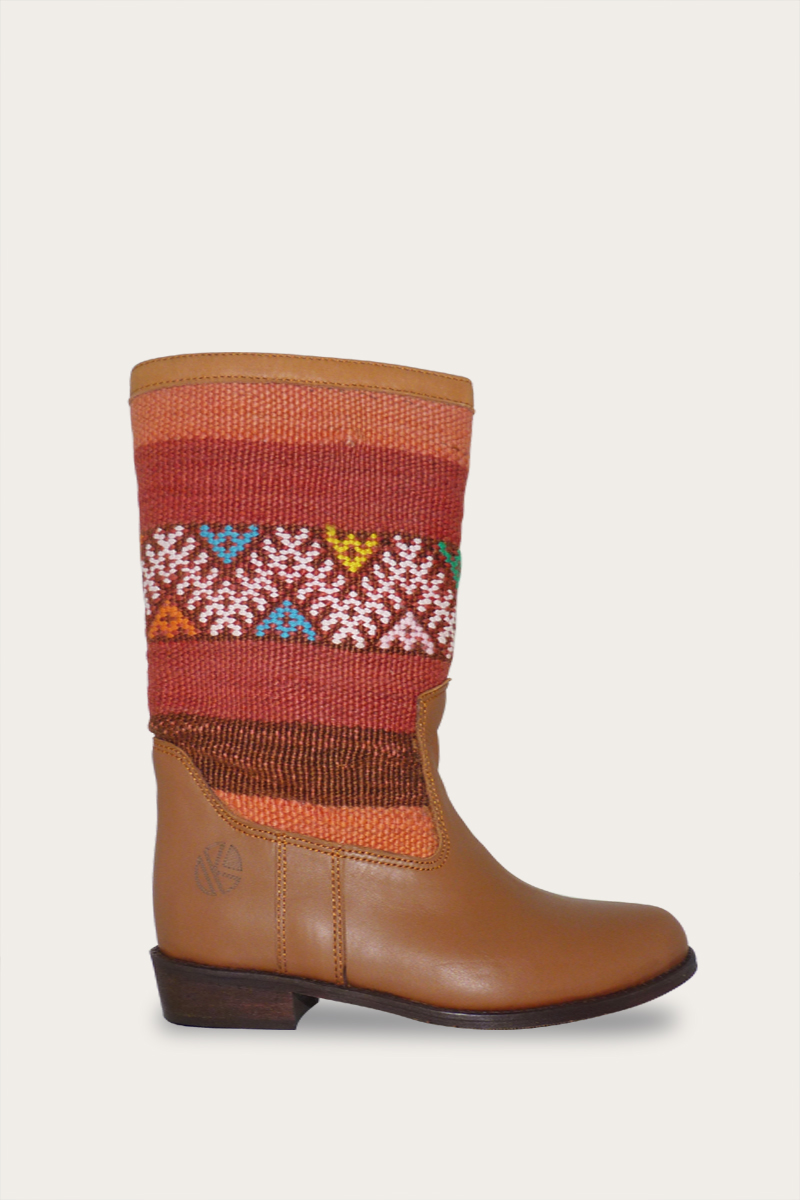 Our gorgeous handcrafted Lee Ann boots are made from repurposed original Kilim rugs and quality artisan leather. Our versatile flat heel ankle boots add a casual chic flare to any outfit from skinny jeans to skirts.