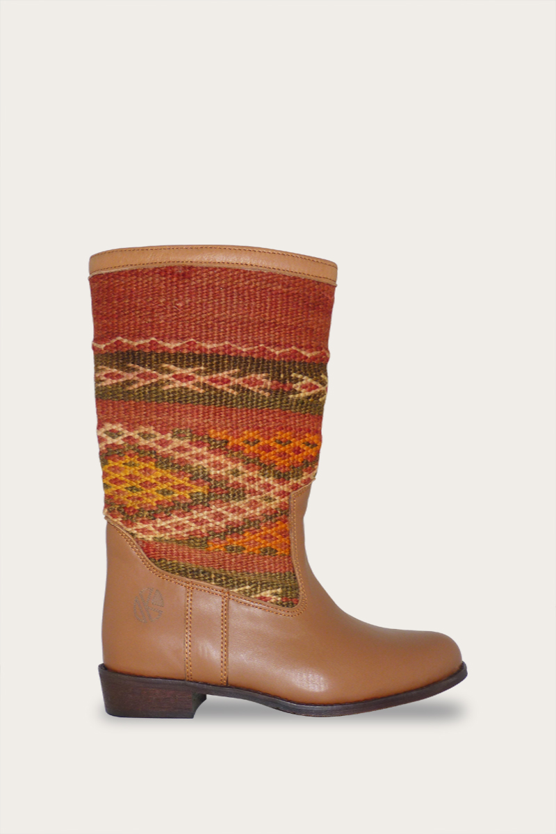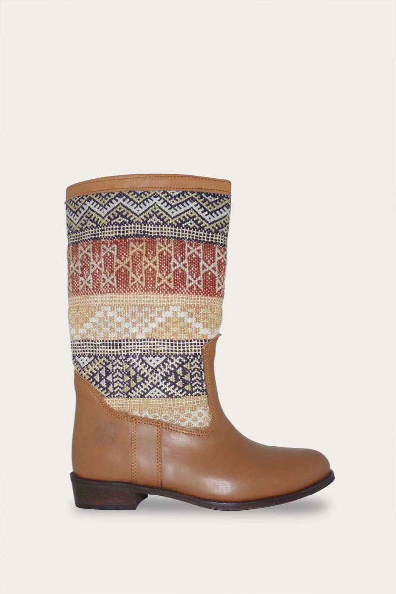 Our gorgeous handcrafted Lee Ann boots are made from repurposed original Kilim rugs and quality artisan leather. Our versatile flat heel ankle boots add a casual chic flare to any outfit from skinny jeans to skirts.