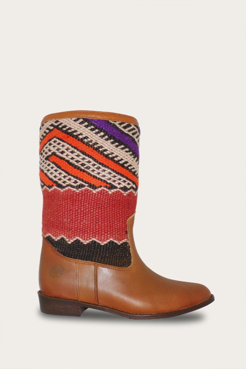 Das Besondere an unseren Stiefeln ist, dass der Schaft aus „upcycelten“ Kelim-Teppichen besteht. Sorgfältig ausgewählt nach Größe und Farbe, unter anderem aus Marokko und der Türkei. Das macht jedes Paar Stiefel unserer Kollektion zu einem „Einzigartig“