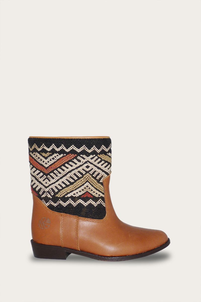 Wat onze laarzen zo speciaal maakt, is dat de schacht is gemaakt van “upcycled” kelim tapijten. Zorgvuldig geselecteerd op maat en kleur uit o.a Marokko en Turkije. Dit maakt elk paar laarzen in onze collectie “one-of-a-kind”