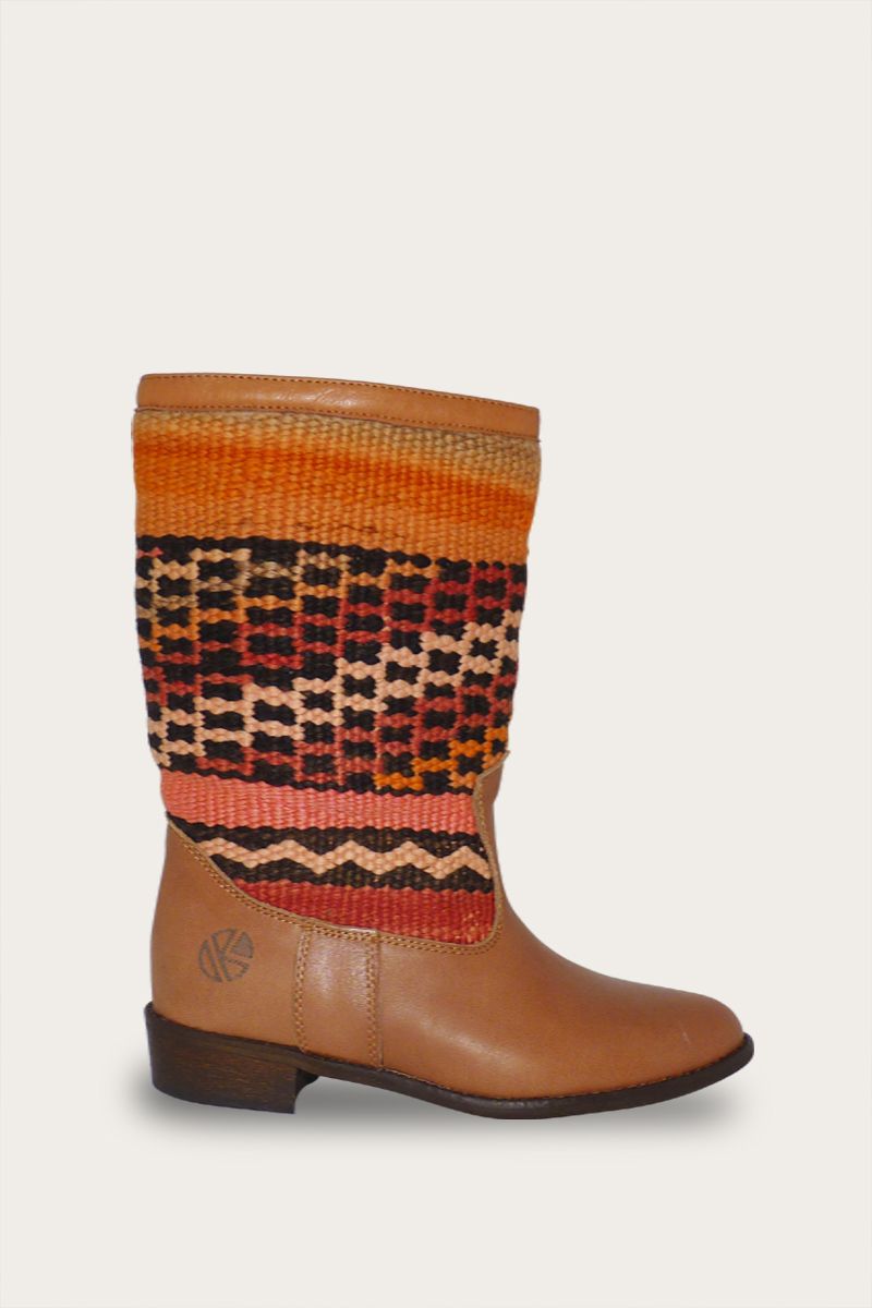 Wat onze laarzen zo speciaal maakt, is dat de schacht is gemaakt van “upcycled” kelim tapijten. Zorgvuldig geselecteerd op maat en kleur uit o.a Marokko en Turkije. Dit maakt elk paar laarzen in onze collectie “one-of-a-kind”