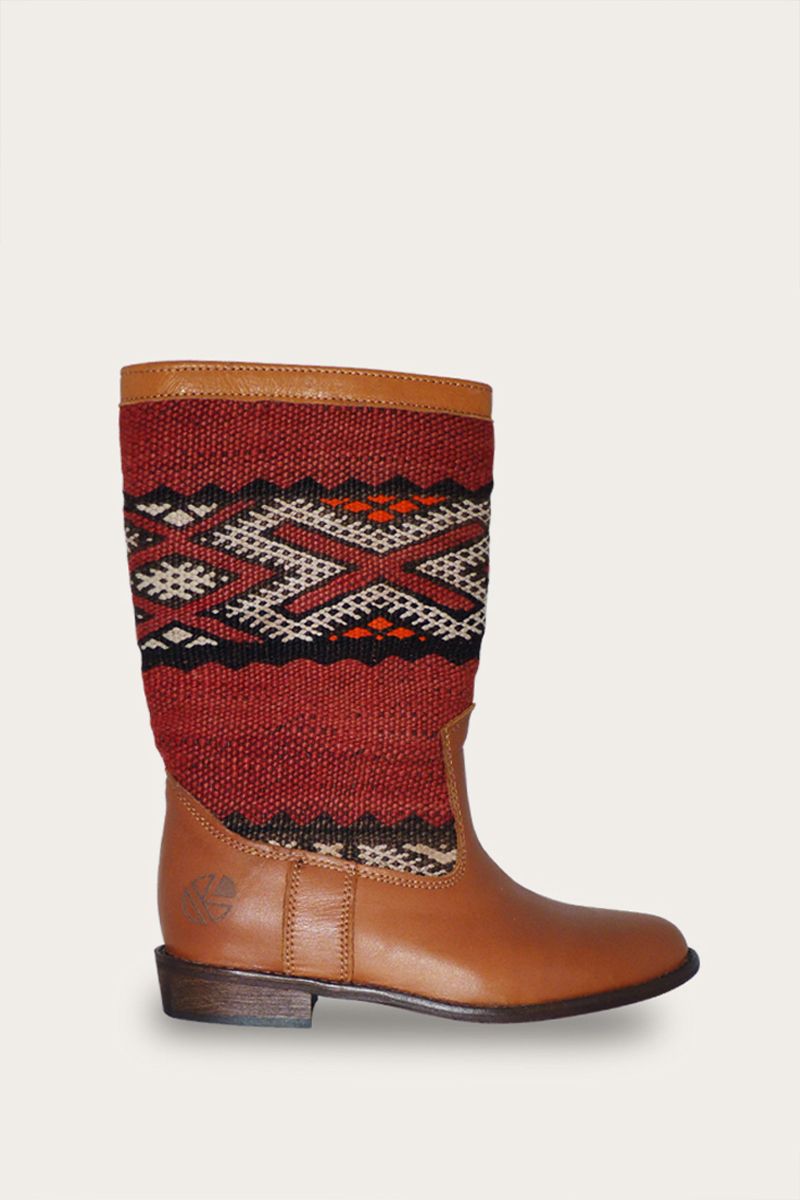 Wat onze laarzen zo speciaal maakt, is dat de schacht is gemaakt van “upcycled” kelim tapijten. Zorgvuldig geselecteerd op maat en kleur uit o.a Marokko en Turkije. Dit maakt elk paar laarzen in onze collectie “one-of-a-kind”