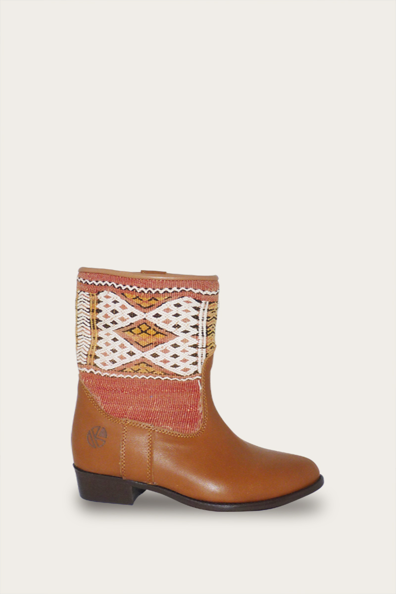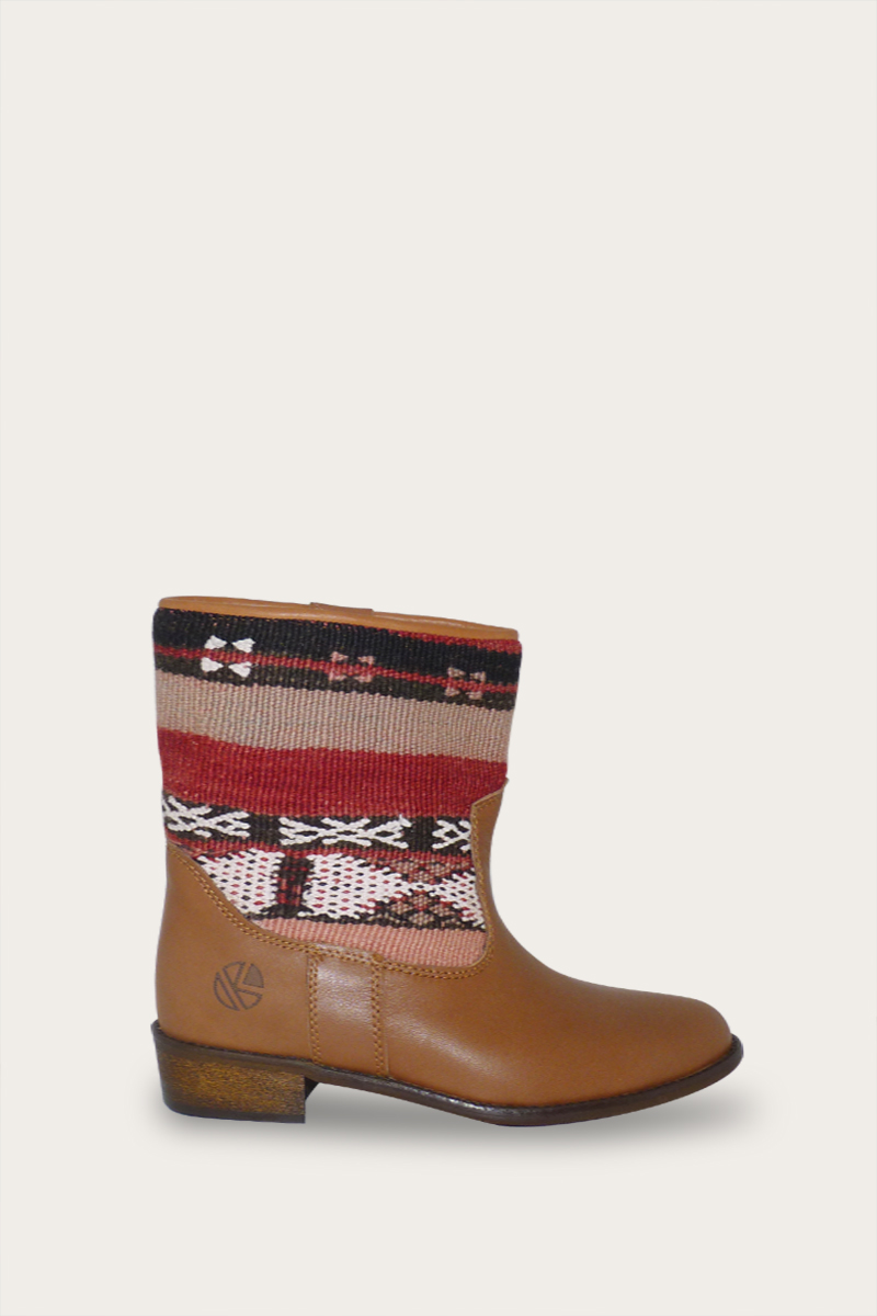 Onze Jimi enkellaars platte hak voor die eigentijdse, bohemien uitstraling. Voor de platte hak enkellaars hebben onze lokale ambachtsmensen een handgeweven vintage Kelim tapijt hergebruikt en samengebracht met het beste leer.