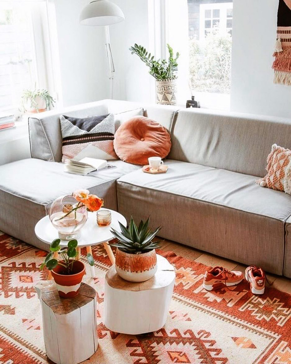 Previous Image Bright, Airy Living Room with a Reversible Kilim Rug Enjoy movie night or lazy summer days in your beautifully decorated living room outfitted with our large kilim rug. Cozy living room with a large couch, funky coffee table and brightly patterned kilim rug